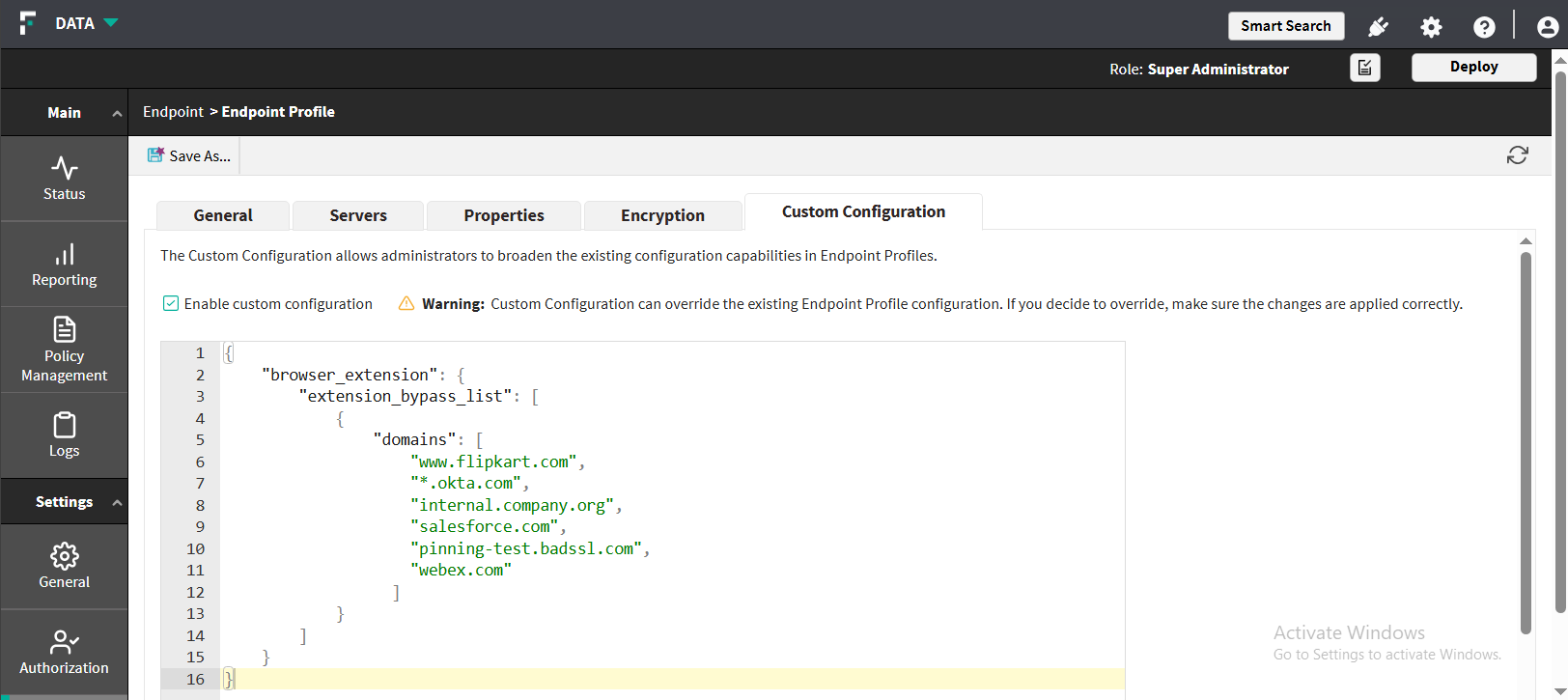 - The endpoint retrieves the bypass list from the Custom Configuration section and applies it during normal configuration processing.