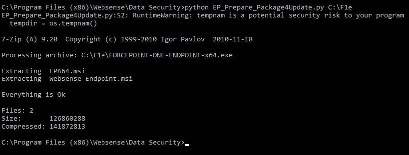 The executable files in the EP_UPDATE_ROOT/data folder, as well as the metadata file in the .private folder, need to be renamed from FORCEPOINTONE- ENDPOINT to WebsenseEndpoint: