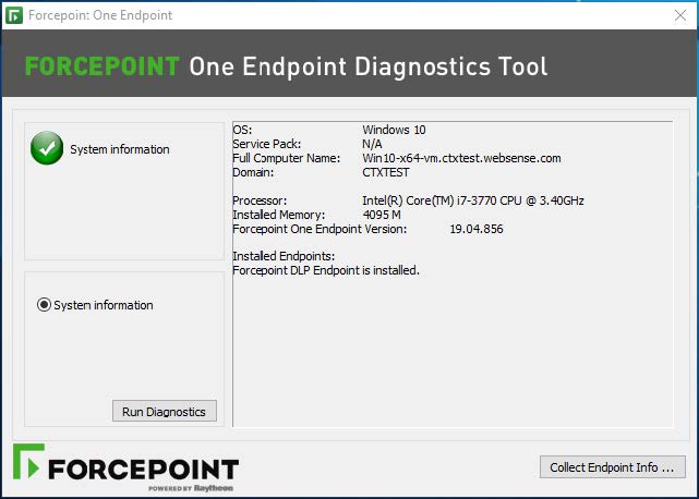 When you launch the tool, the Diagnostics Tool automatically executes the System information diagnostics test, which collects basic information related to the specific endpoint machine on which the Forcepoint DLP Endpoint software is installed. To manually run the diagnostics test, click the Run Diagnostics button.