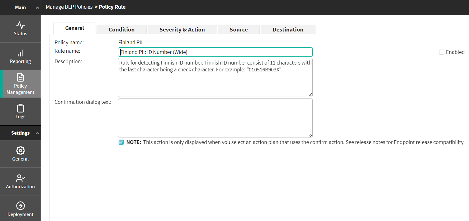 <link>url="https://forcepoint.com" text="More Info"</link>. - The required policy must have the confirmation action before implementation.