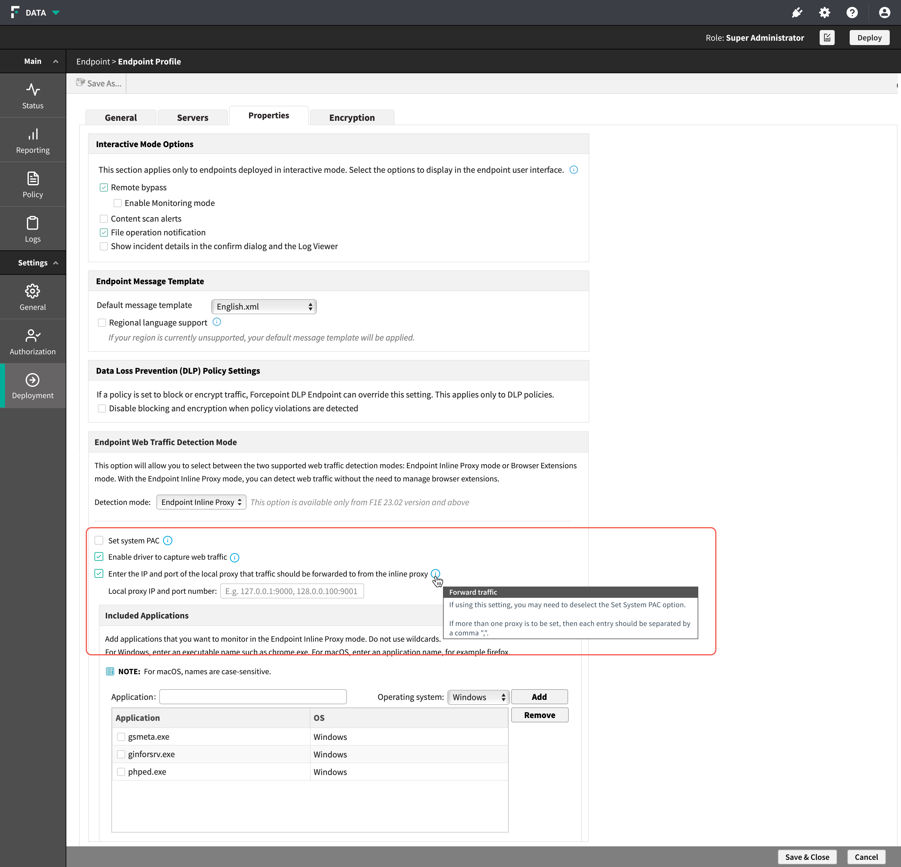 - Click Deploy.Note: Update the Forcepoint DLP Endpoint software.