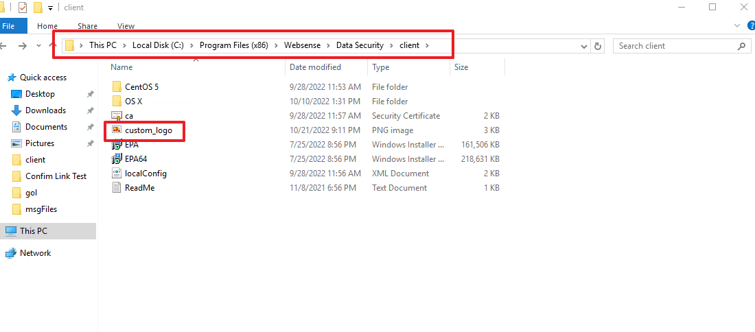 - On the DLP Server, navigate to C:\Program Files(x86)\Websense\Data Security\client. (See the image below)