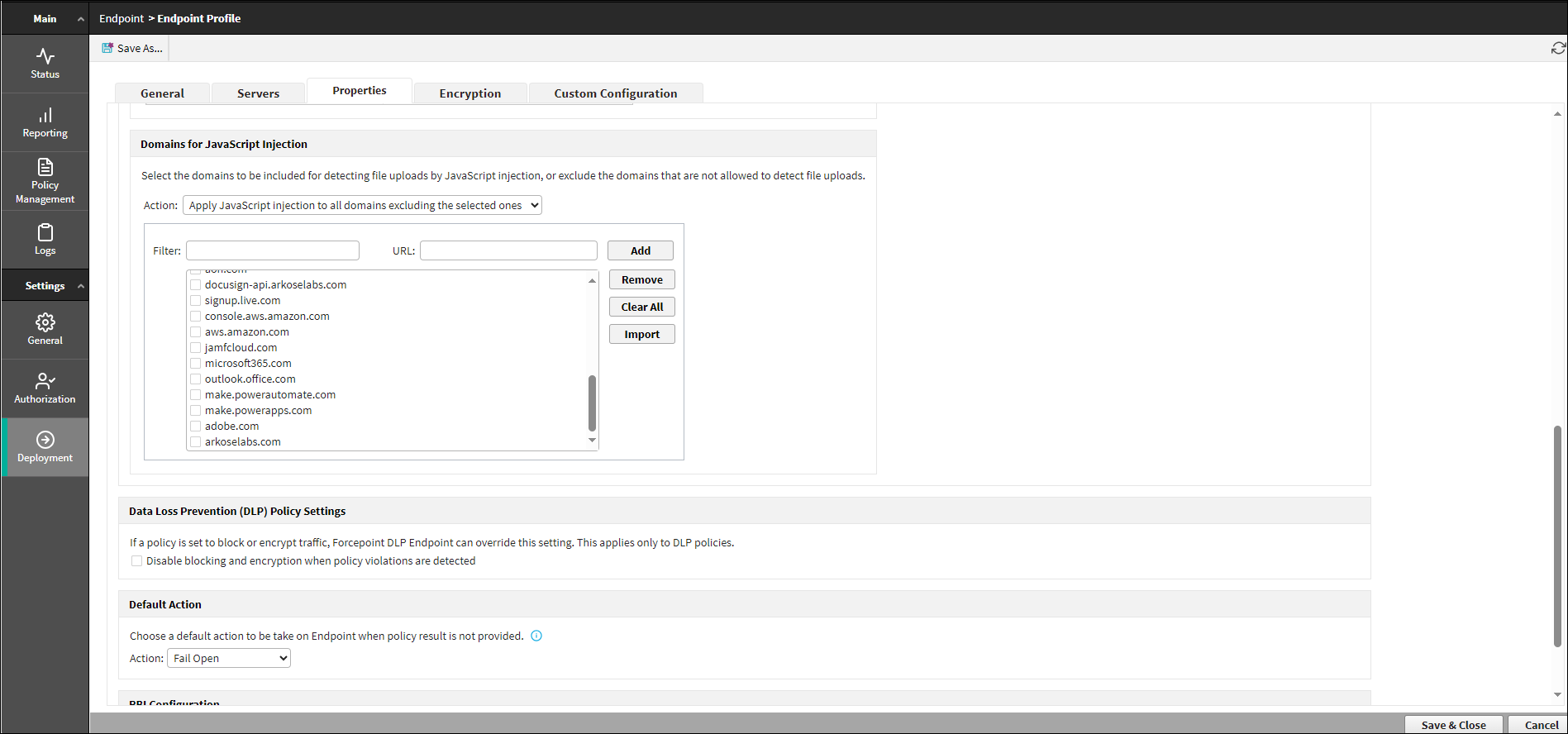 In Forcepoint Security Manager (FSM) 10.2 onwards, you can add or remove a domain to or from the domain list of an endpoint profile. When you add a domain URL to the list, JS injection