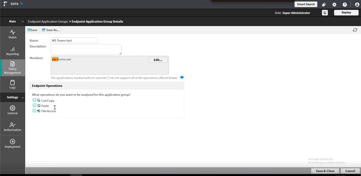 The Belongs to field displays the relevant application group where the blocking configuration is applied. The group is managed under . In the Endpoint Operations section in the Endpoint Application Group Details view, the File Access option is enabled which blocks the upload of sensitive files in Teams.