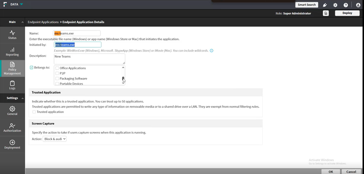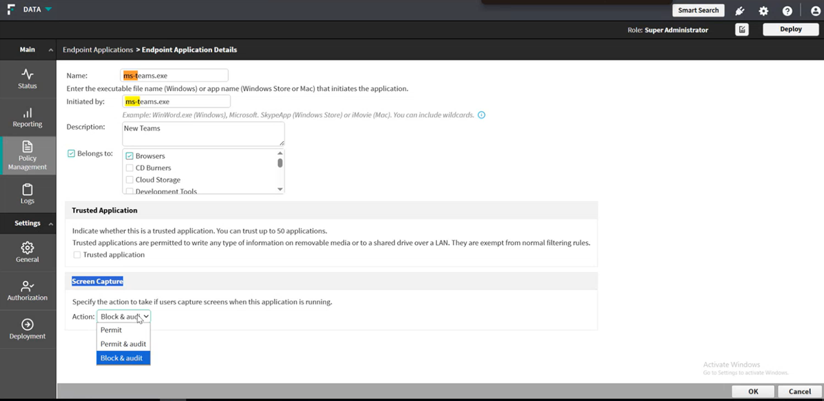 Additionally, in the Endpoint Application Details view, under the Screen Capture section, the Block & audit action is enabled to prevent screenshots of Microsoft Teams, ensuring sensitive content cannot be captured.