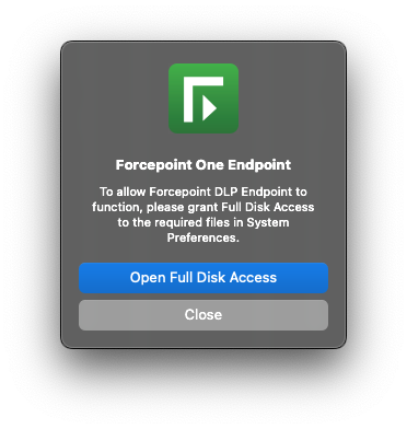 Note: If you are installing Forcepoint DLP Endpoint v21.12 or later on macOS 13 (Ventura) or macOS 14 (Sonoma), message appears for you to enable full disk access (FDA) for four new processes. (The instructions here are explained with reference to macOS 15 Sequoia. Follow the similar instructions for other operating systems).