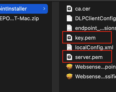 If you are deploying a Forcepoint DLP Endpoint package, add the private key file key.pem and the certificate file server.pem to the