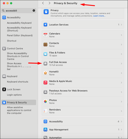 To grant Full Disk Access(FDA) access, navigate to Privacy & Security > Full Disk Access, and do the following.