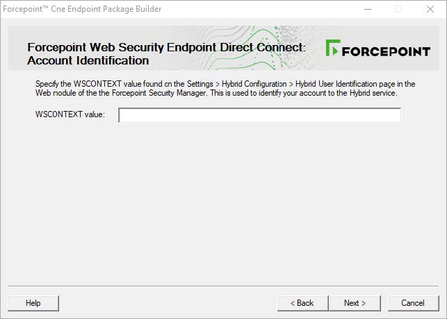 The WSCONTEXT value is displayed in the GPO script command string on the Settings > Hybrid Configuration > Hybrid User Identification page in the Web Security module of the Forcepoint Security Manager, or the GPO code string under Deployment Settings on the Web > Endpoint > General page in the Forcepoint Cloud Security Gateway Portal. See Forcepoint Web Security Endpoint packages downloaded from the Forcepoint Cloud Security Gateway Portal (Cloud deployments) for more information.