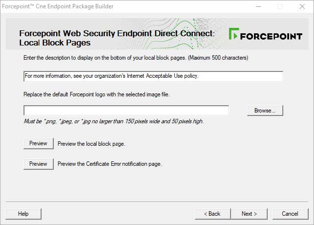 On the Local Block Pages screen, you can change the description and logo shown at the bottom of the local block pages. Forcepoint Web Security Direct Connect Endpoint uses local block pages when it is in Fallback mode and cannot connect to endpoint services. These pages are only shown when in Fallback mode. If Forcepoint Web Security Direct Connect Endpoint is connected to endpoint services, the default block page is shown.- Click the first Preview button to view the local block page with the changes you made at the top of the screen.