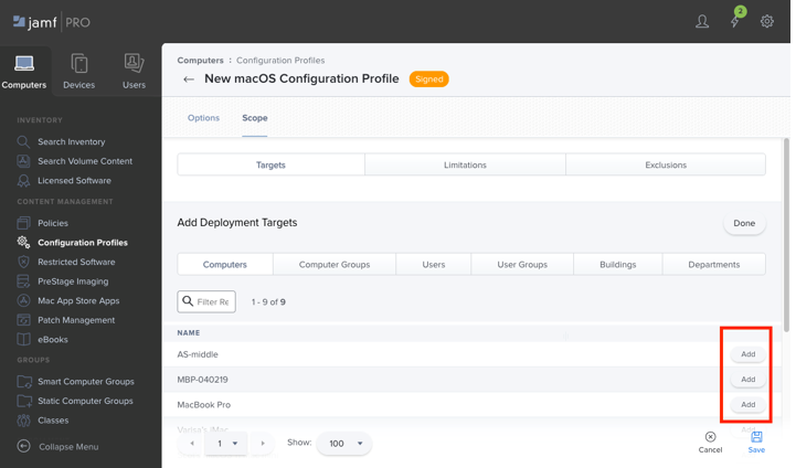 After the file has been uploaded successfully, select the Scope tab, and click Add to add one or more enrolled targets (i.e. endpoint