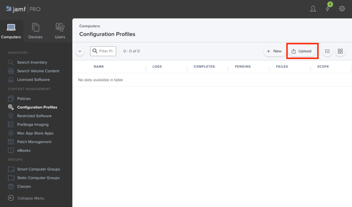 On the Computers tab, select Configuration Profiles, then click Upload.