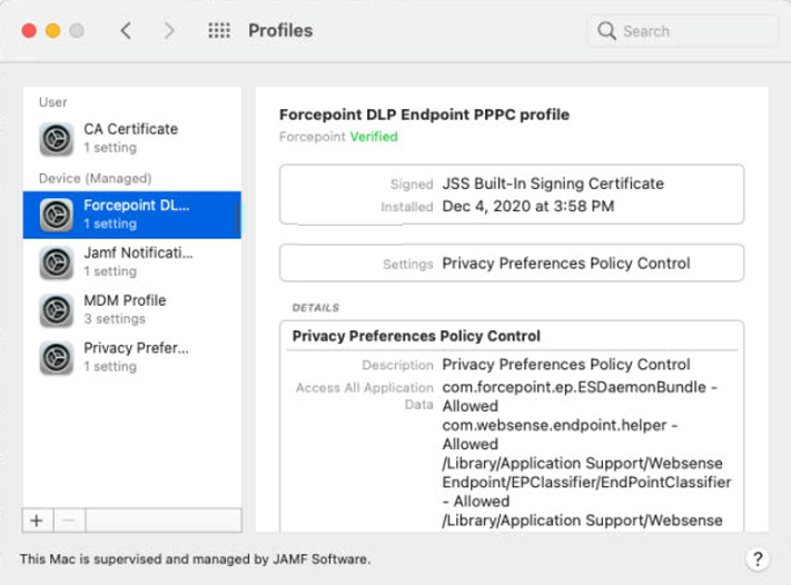 then the Forcepoint DLP Endpoint PPPC profile policy is present.