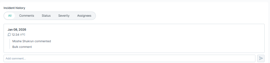 - Incident history: Shows all actions related to an Alert in chronological order. Includes the status changes, severity changes, assignment changes and any
