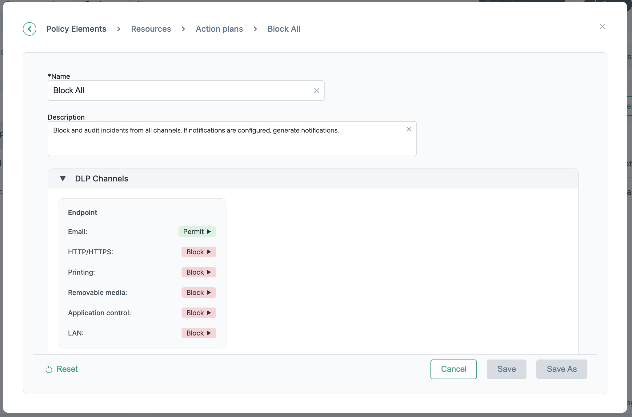 | Block All | Block all incidents on all channels, audit them. This action plan is designed for severe breaches. |