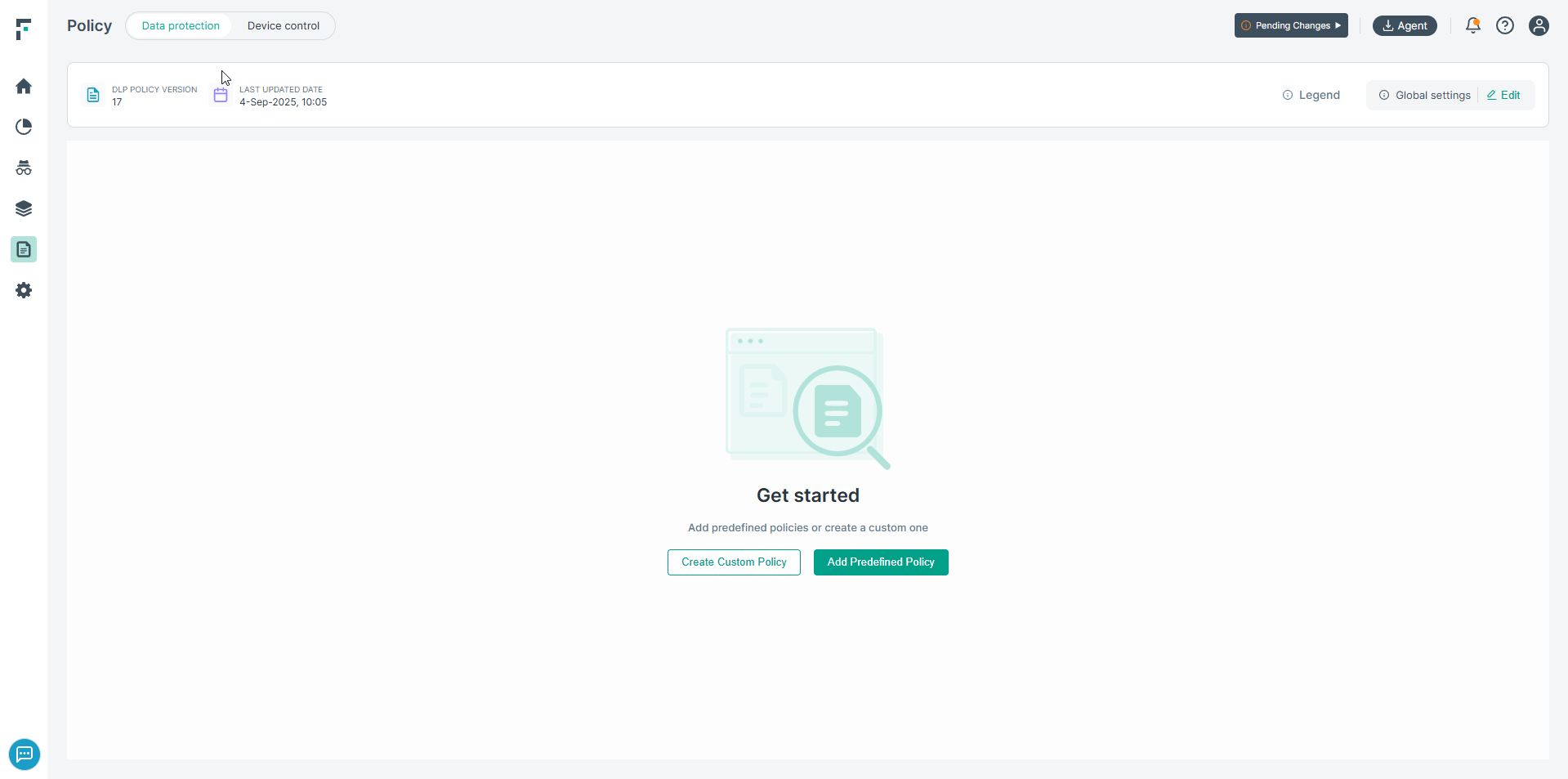 When there are no policies defined in the system, upon log in to the Forcepoint Data Security Cloud portal and navigating to the DLP app, the following screen is displayed: