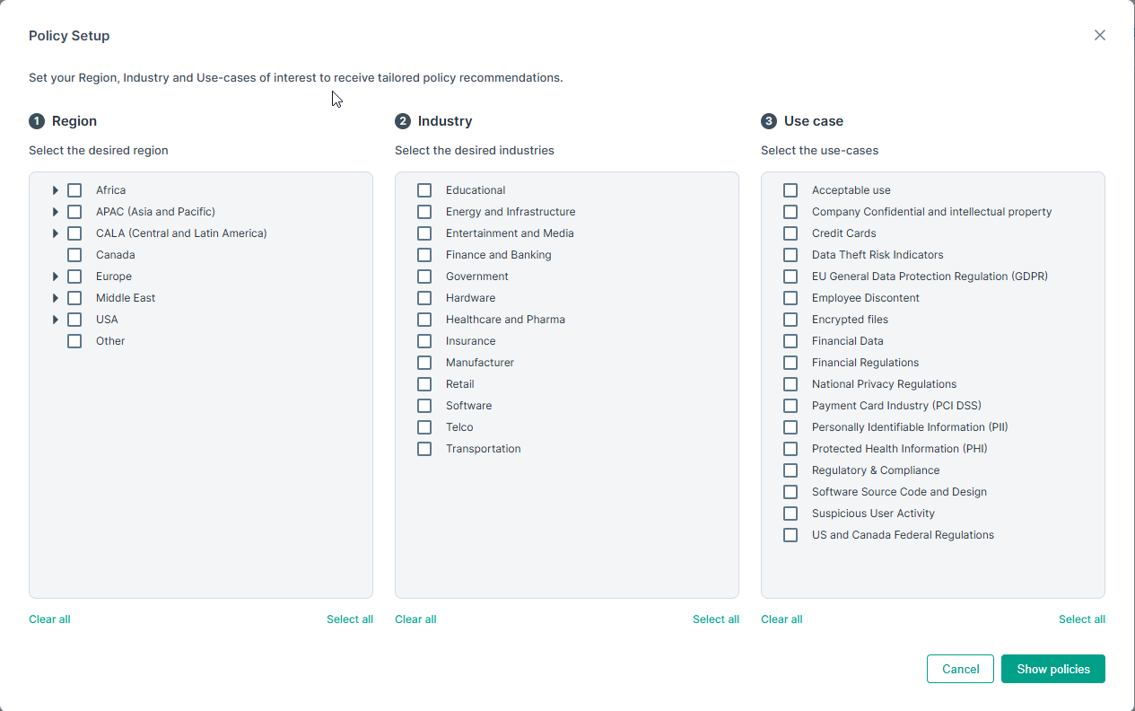 The policy quick setup wizard helps the admins to quickly create policies using Forcepoint comprehensive set of predefined policies.