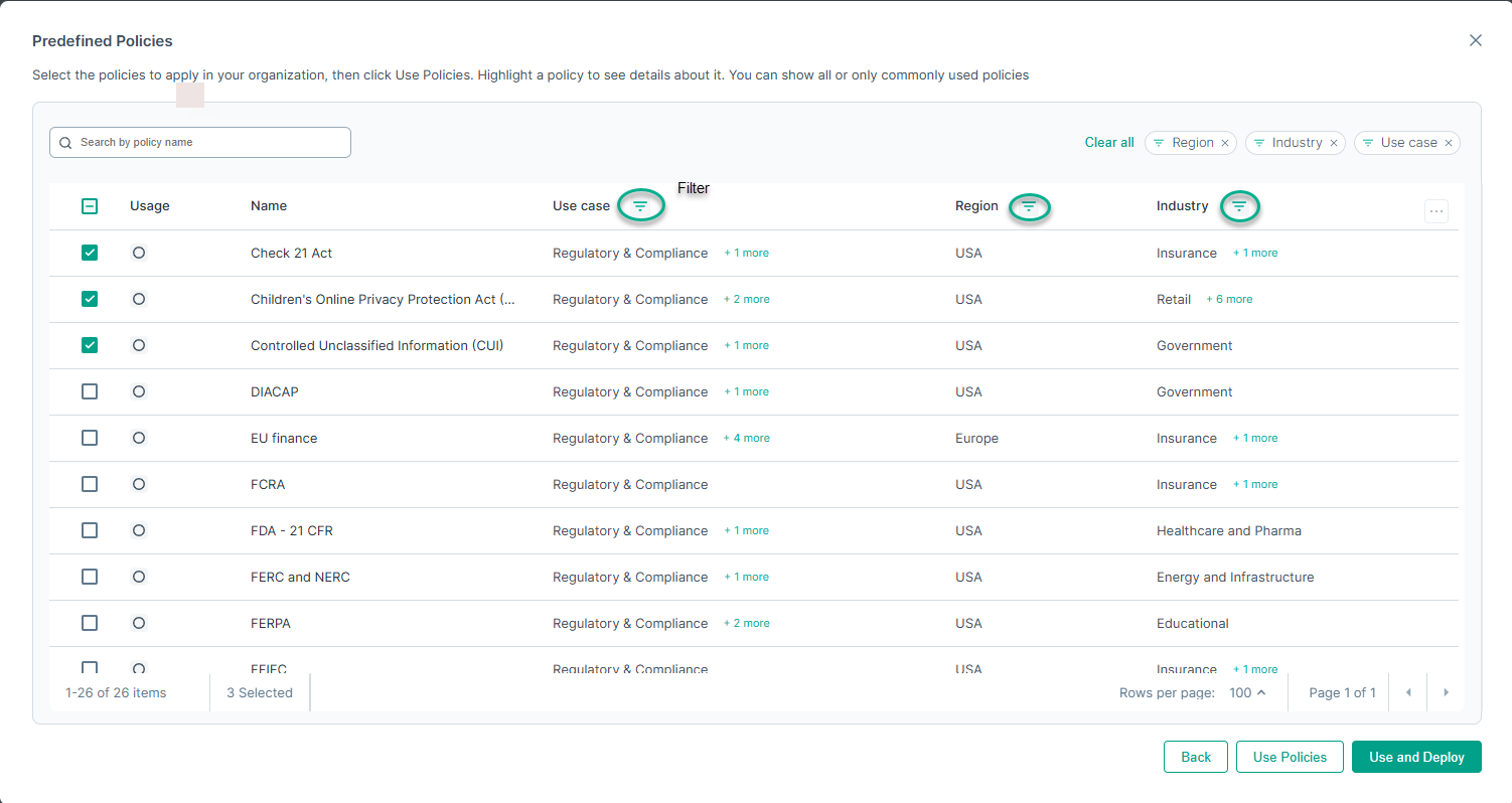 - To add the policies to your list of policies select the checkbox next to specific policies. You can also filter the policies based on different fields as indicated below. For example you can