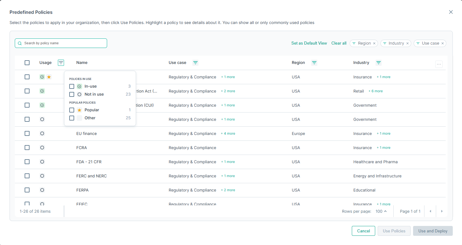 Once you have selected the policies, you can either just add them to the policy list by clicking the Use Policies button or add and deploy them simultaneously using the Use and Deploy Button.