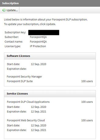 - In the Forcepoint Security Manager, go to DATA > Settings > General > Subscription. The Subscription page displays your current license information.