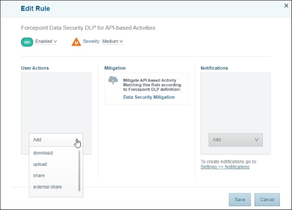 If a user performs an action that matches the action selected here, Forcepoint CASB performs the selected mitigation.