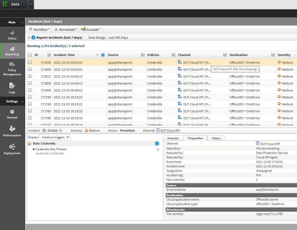 Viewing and managing reports for the DLP Cloud Applications feature is the same as for the on-premises DLP. The main change involves what is displayed for a DLP incident:
