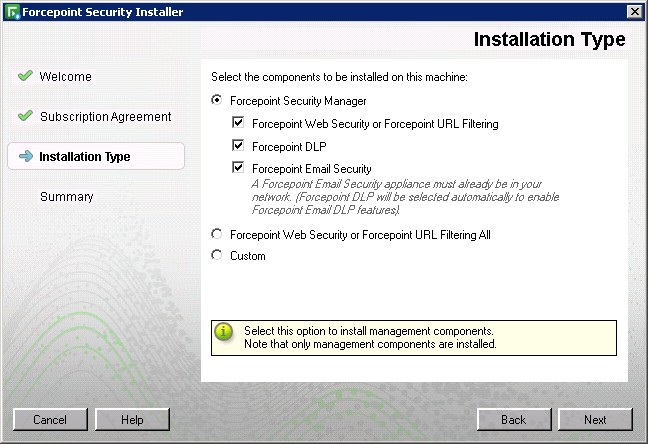 - On the Installation Type screen, select Forcepoint Security Manager and the modules you want to install (Web, Data, or Email).