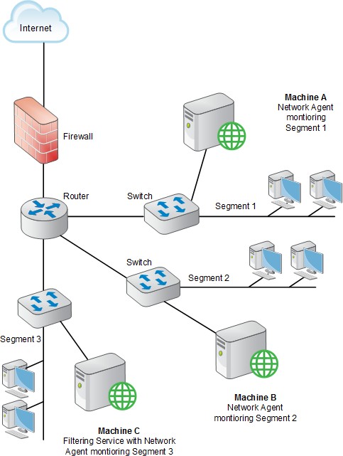Network Agent can be installed on the gateway machine, allowing Network Agent to manage and monitor all Internet traffic. The gateway can either be a third-party proxy server or a network appliance.