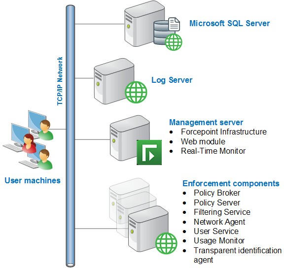 For evaluation or very small (low traffic) deployments, all components, plus an instance of SQL Server Express (installed by the Forcepoint Security Installer, in certain cases) may reside on a single Windows server.