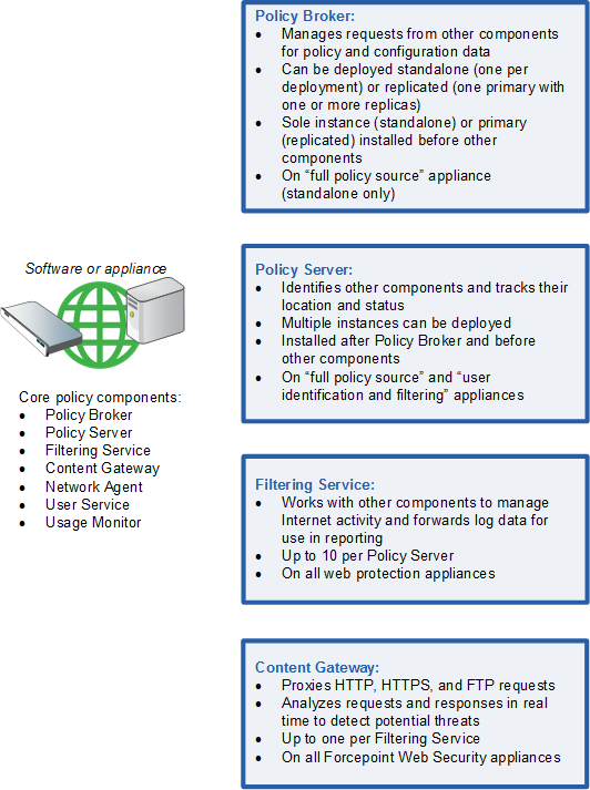 - With Forcepoint appliances, the standalone Policy Broker is present on the full policy source appliance only.