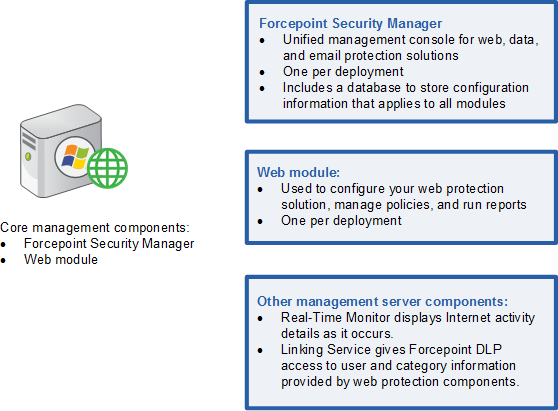 - Install all Forcepoint Security Manager components on a single Windows server (the management server).