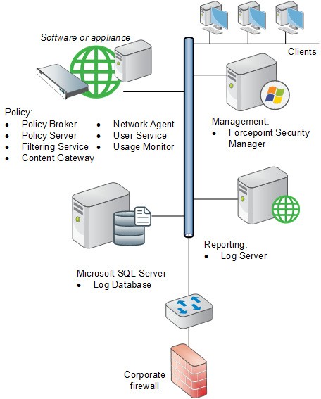On-premises web protection solutions include the core policy, management, and reporting components shown in the diagram below and described in detail in the sections that follow, with one exception: Content Gateway is available only for Forcepoint Web Security.