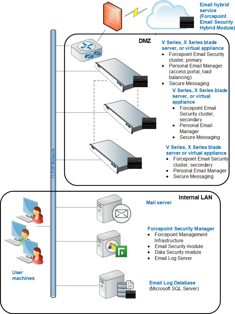 Multiple V Series appliances are configured in a cluster for this deployment scenario. You may also consider multiple virtual appliances or X10G blade servers for this scenario. This email protection environment includes the Email Security Hybrid Module in-the-cloud analysis. See Single email appliance with Email Security Hybrid Module, for information about the email hybrid service.