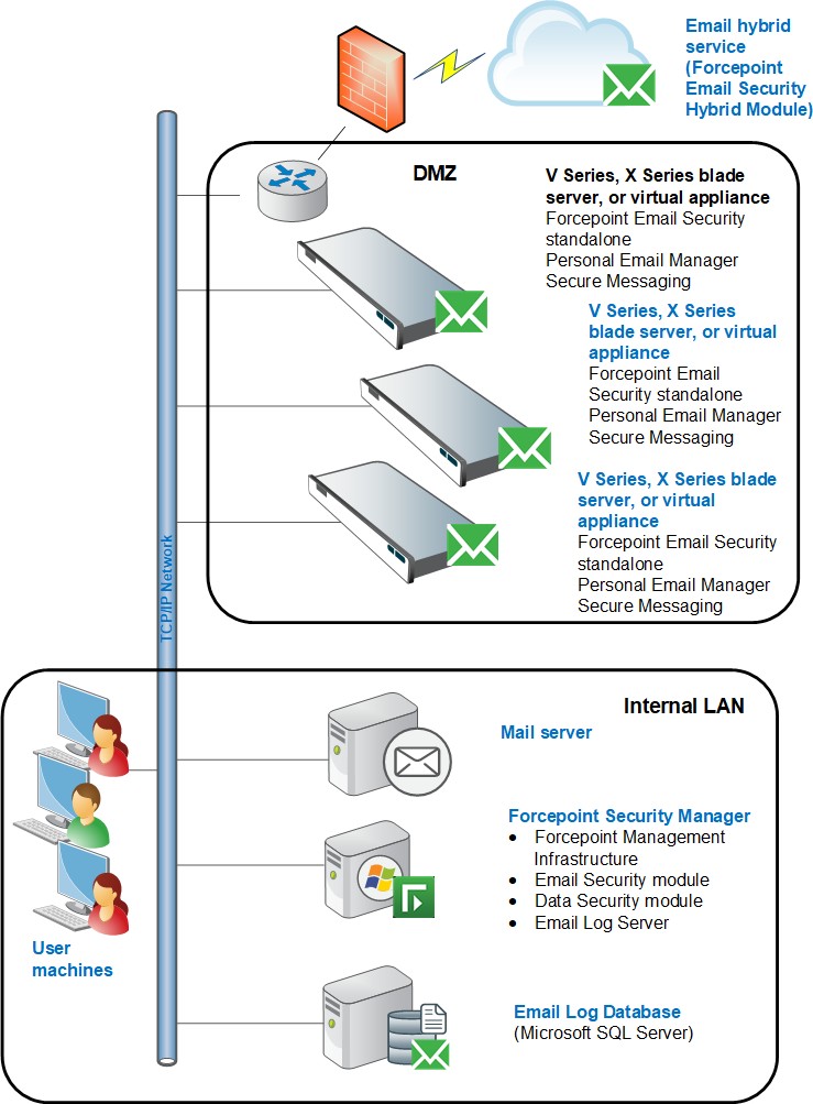 These environments include the Forcepoint Email Security Hybrid Module in-the-cloud filtering. See Single email appliance with Email Security Hybrid Module, for information about the email hybrid service.