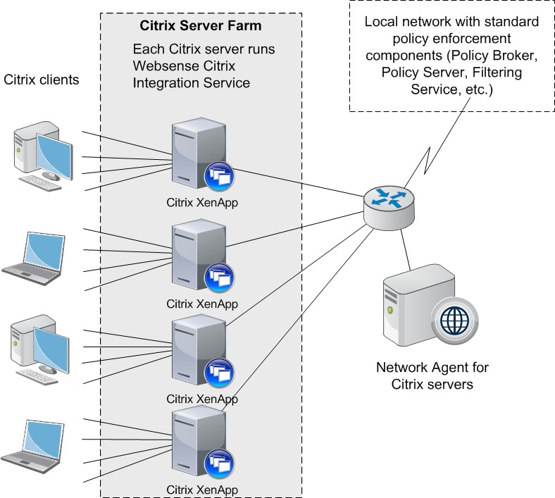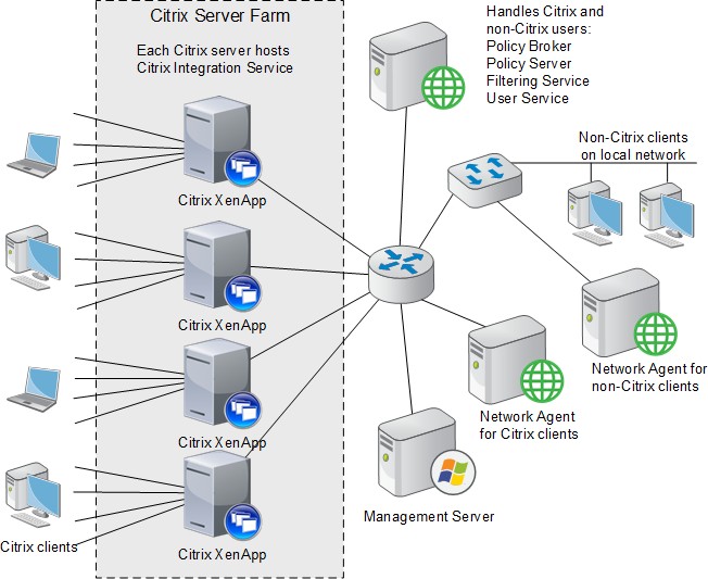 - The Filtering Service and Network Agent instances monitoring Citrix traffic use the same Policy Broker, Policy Server, User Service, and other components as the Filtering Service and Network Agent instances used to monitor non-Citrix traffic.
