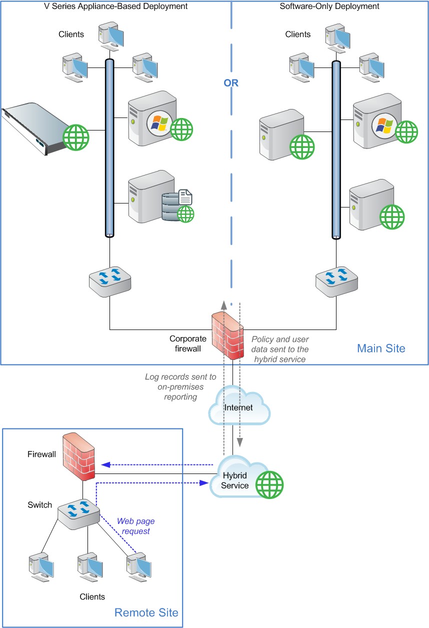 In an on-premises Forcepoint Web Security deployment, Internet requests from remote sites can be managed by either by software installed at the main site, or with the Web Security Hybrid Module, by the hybrid service in the cloud.