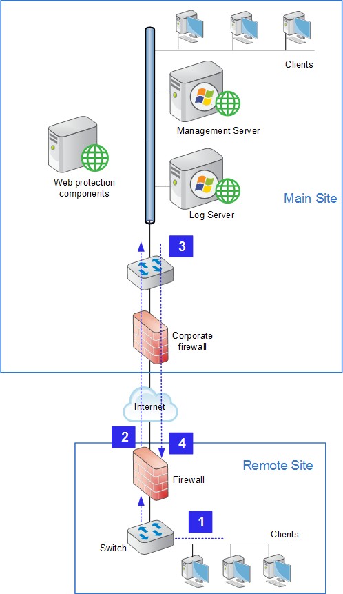 - The request is directed through the local firewall to web protection software at the main site via the Internet.