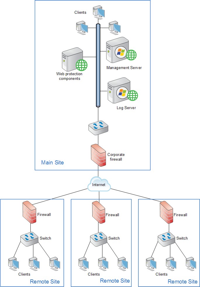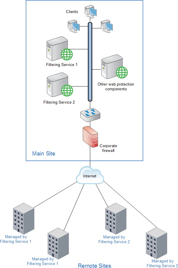 Each remote site would be managed as shown in the illustration under Forcepoint URL Filtering. The site at which the software is deployed is represented as the “main site”, but need not be truly a main site in your organization. It is whichever one houses the web protection software.