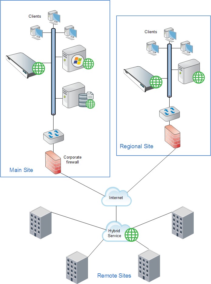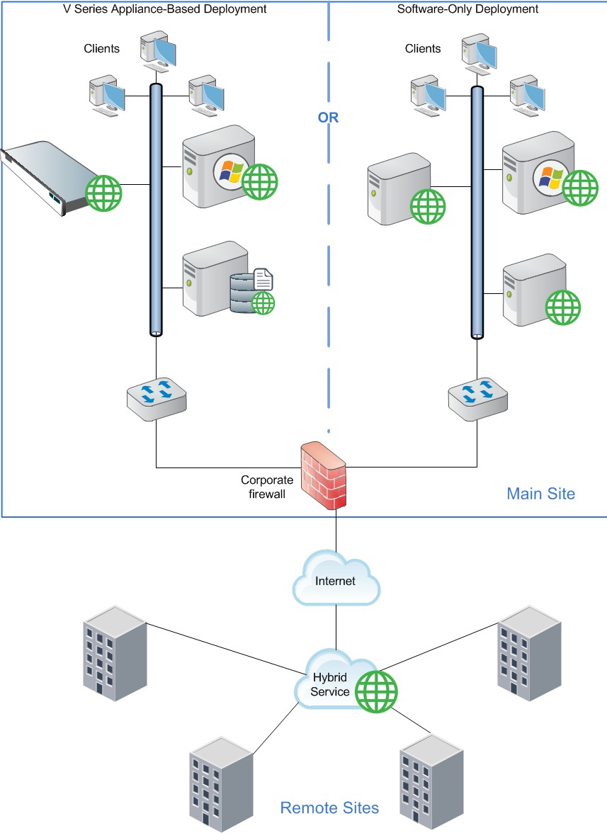 Organizations with multiple large sites (such as main headquarters and regional headquarters) can deploy on-premises software at the larger sites while managing small, remote sites through the hybrid service. Though the illustration shows a V Series appliance deployment, this can also be accomplished with X Series and virtual appliances and software-only deployments.
