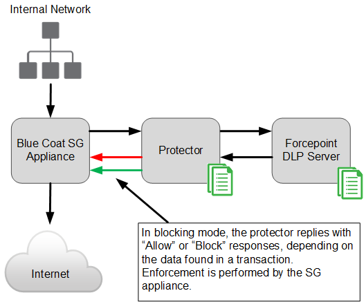 - In enforcement mode, the Blue Coat SG appliance requires Forcepoint DLP to authorize each transaction before allowing files to be posted or uploaded to their