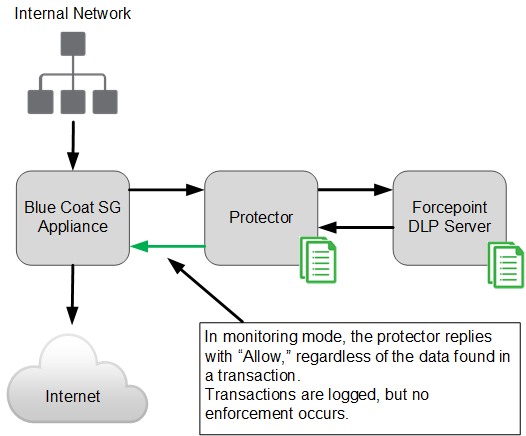 - In monitoring mode, the transactions that are redirected by the Blue Coat SG appliance are analyzed by Forcepoint DLP, which can then generate incidents for confidential information