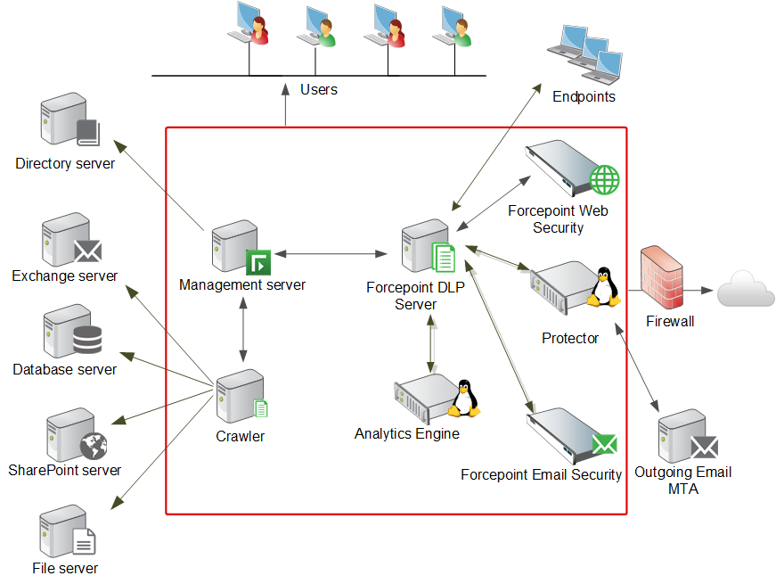 The following illustration is a high-level diagram of a larger Forcepoint DLP deployment: