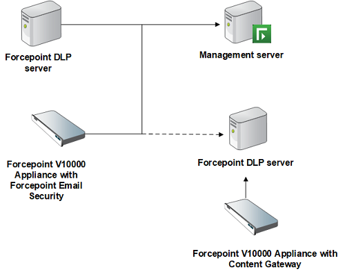 Forcepoint DLP supports multi-site, distributed deployments. An organization can have a local policy engine on the protector, for example, and distributed (primary and secondary) fingerprint repositories. There can be a management server in one location and one or more supplemental Forcepoint DLP servers in other locations.