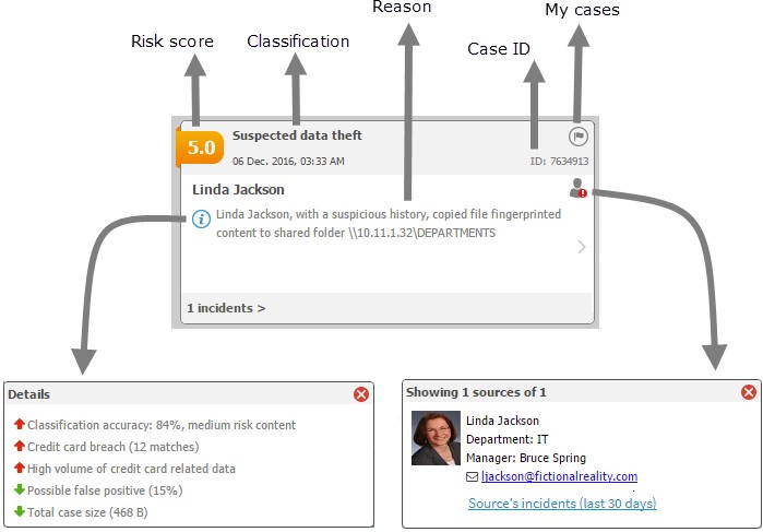 - Incidents within cases are ranked according to their number of matches, transaction size, content, breached policies and rules, date and time, and more.
