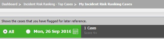 This report shows the cases that you have marked with a flag for later reference. This is the same list that appears when you click My Cases on the Top Risks report toolbar.