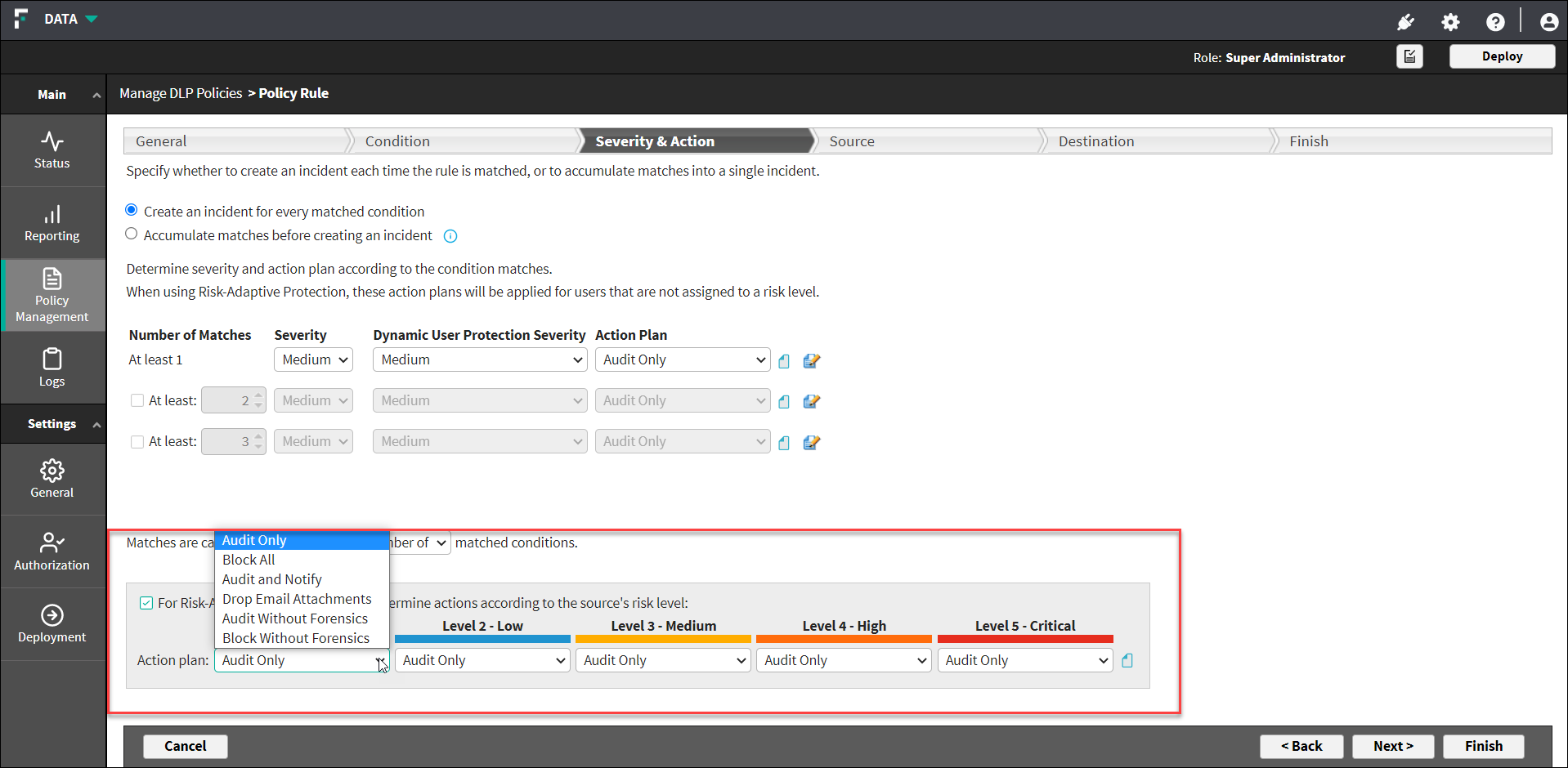If you are using Risk-Adaptive Protection to determine actions according to the source’s risk level, select an action plan for each one of the risk levels (1-5). For each severity level in a rule, you can also configure a Dynamic User Protection Severity value that impacts the risk score calculation for a user in Forcepoint Dynamic User Protection. The following severity levels are available: