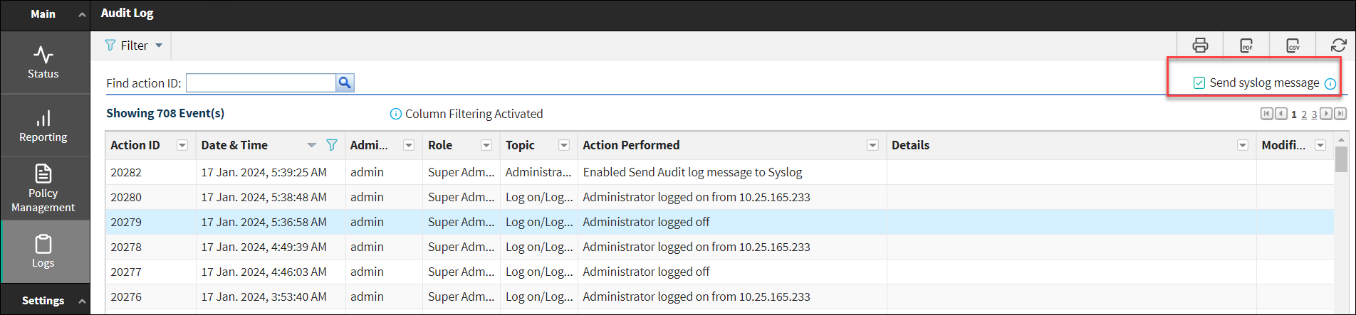 To send Audit log data to the syslog server, enable the check box Send syslog message.