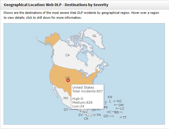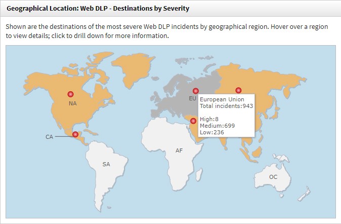 Forcepoint DLP can monitor or restrict data being sent via the Web to specific countries. Geolocation reports display incidents by the geographical location to which data was sent.