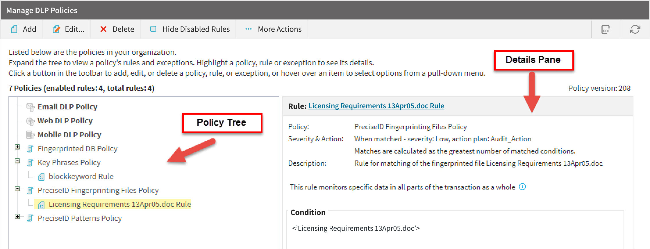 Policies appear in a tree-view structure in alphabetical order under their assigned level, if any. You can add policies any time. Each policy consists of a set of rules and a possible set of exceptions.