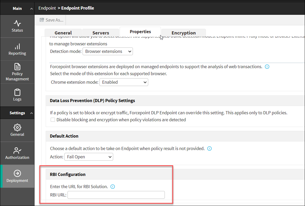 This feature enables an administrator to specify the RBI solution’s URL, which allows the Endpoint to enforce the DLP policies on the original URL that the end user addresses to.